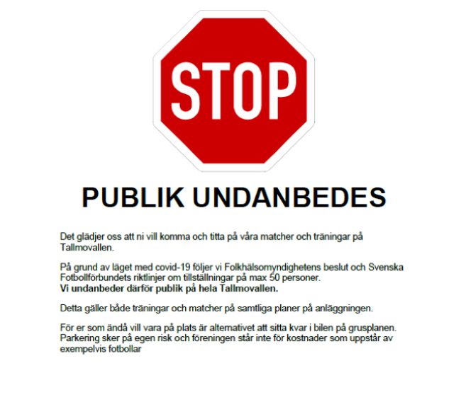 Vill påminna om vårt beslut att publik undanbedes på Tallmovallen. Detta gäller både träningar och matcher På grund av läget med covid-19 följer vi Folkhälsomyndighetens beslut och Svenska Fotbollförbundets riktlinjer om tillställningar på max 50 personer. Vi undanbeder därför publik på hela Tallmovallen. Detta gäller både träningar och matcher på samtliga planer på anläggningen. För er som ändå vill vara på plats är alternativet att sitta kvar i bilen på grusplanen. Parkering sker på egen risk och föreningen står inte för kostnader som uppstår av exempelvis fotbollar Med vänlig hälsningar Styrelsen Östra Deje IK 5 maj 2020 0kommentarer